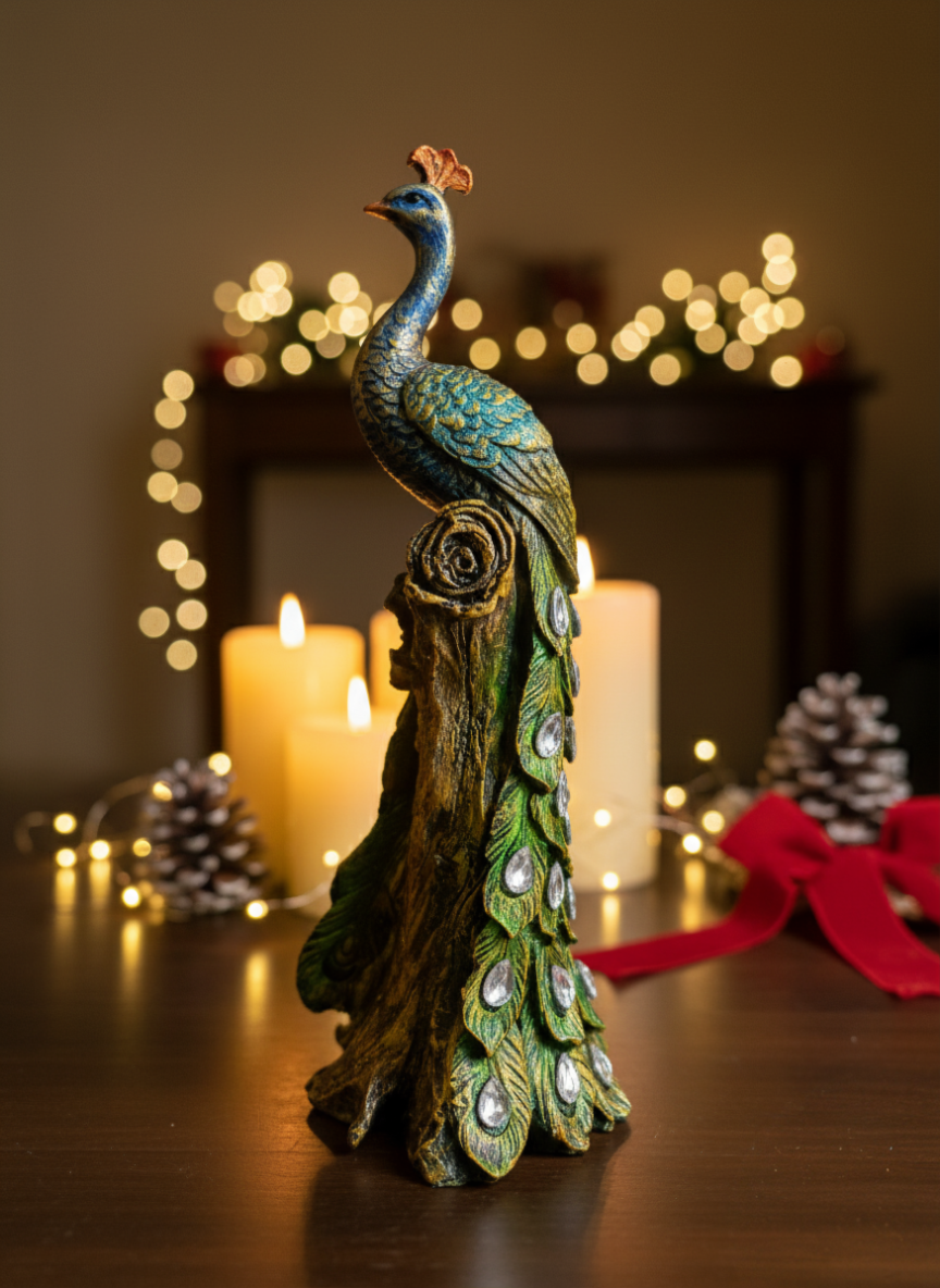 handcrafted resin peacock showpiece with crystals for home décor decorative showpiece 33.02 cm (resin, green, multicolor)Handcrafted Resin Peacock Showpiece with Crystals for Home Décor Decorative Showpiece – 33.02 cm (Resin, Green, Multicolor)
