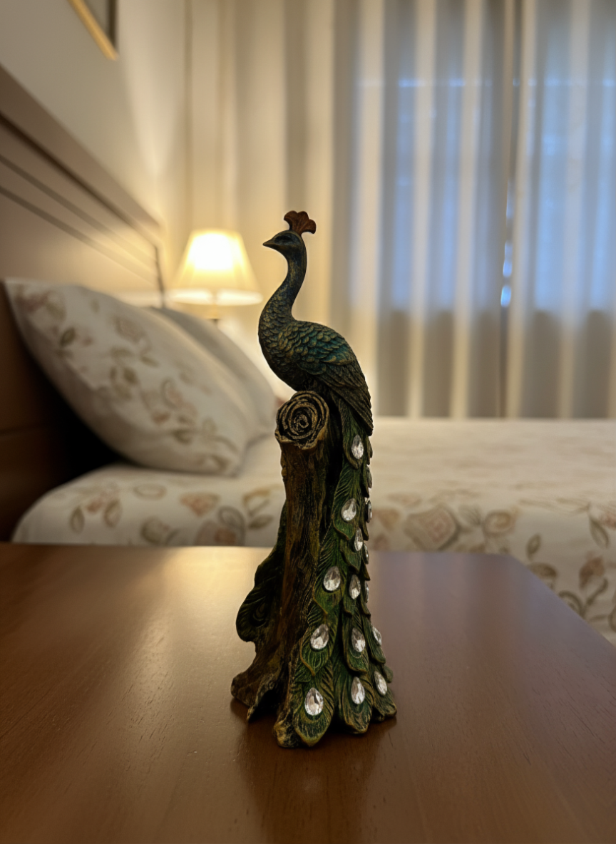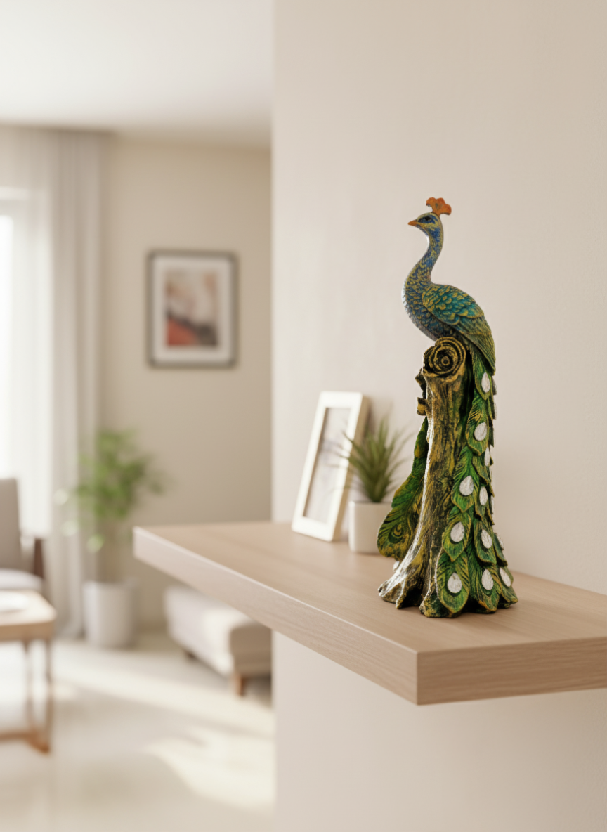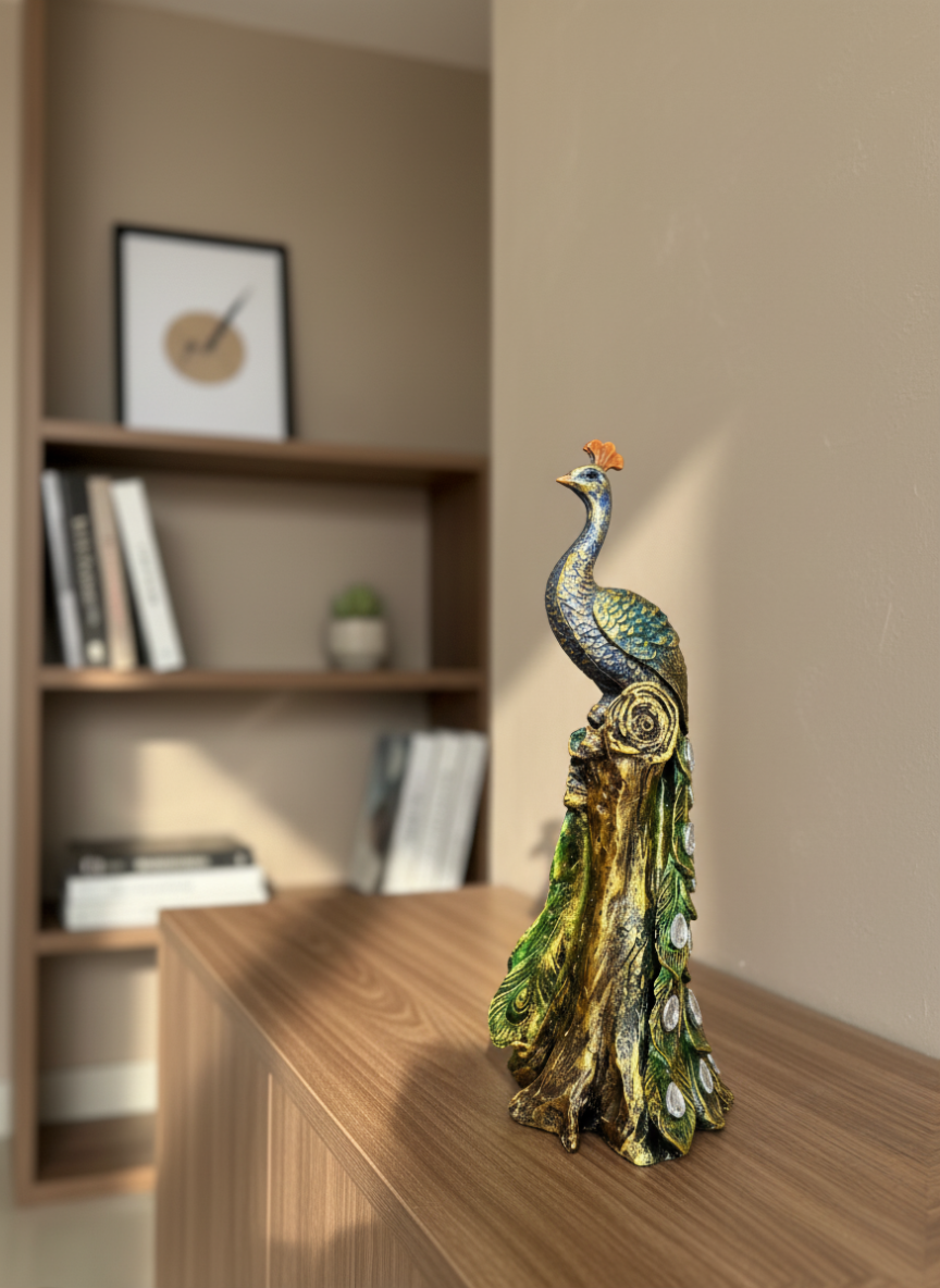 This beautifully handcrafted Resin Peacock Showpiece is a stunning decorative piece for your home or office, crafted with precision and attention to detail. Made from durable resin, it features vibrant green and multicolor hues that create a striking visual impact, perfect for adding an elegant touch to your living room, dining room, or office décor. The intricately designed peacock is adorned with sparkling crystals that catch the light, enhancing its beauty and bringing a sense of luxury to your space. Standing at 4×4.5×12 inches, this peacock figurine is compact enough to fit on tables, shelves, or mantels while making a bold statement. Whether placed on a coffee table, desk, or sideboard, it adds a royal touch to any environment. Its versatile design makes it a perfect fit for modern, contemporary, and traditional interiors alike. Not only does this peacock statue enhance the aesthetic of any room, but it also makes for an excellent gift. Its exquisite craftsmanship and elegant design make it a thoughtful and memorable present for birthdays, housewarmings, anniversaries, and other special occasions. Whether you’re looking to treat yourself or surprise a loved one, this Resin Peacock Showpiece is sure to leave a lasting impression. The perfect combination of beauty, durability, and style, it is a must-have for those who appreciate fine craftsmanship and unique home décor.